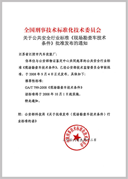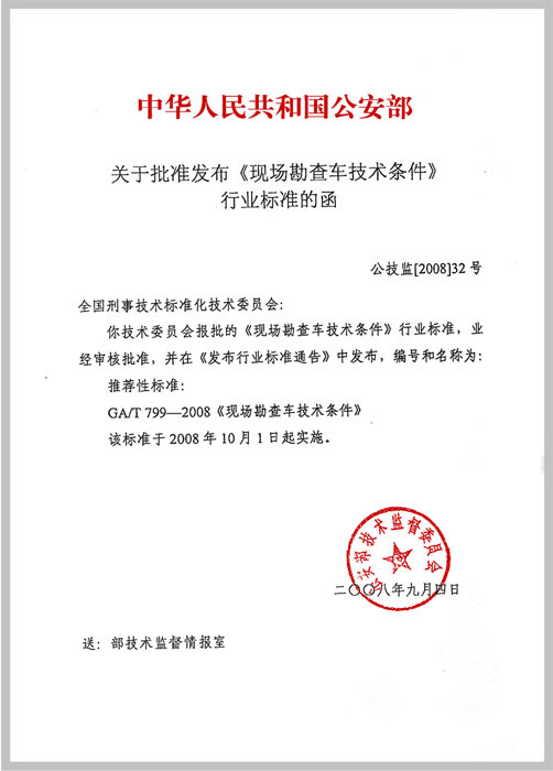 推薦標(biāo)準(zhǔn)為GA/T799-2008 《現(xiàn)場勘查車技術(shù)條件》